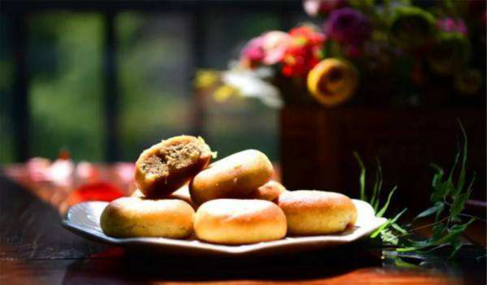 由糖、芝麻,金桔花、茴香拌上桂子油作餡,再放些胡椒,外在裹上面皮,成餅狀烘烤而出。